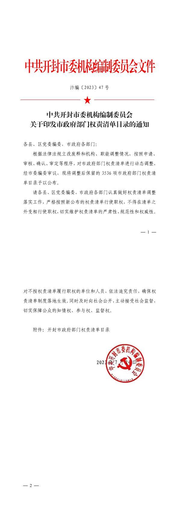 中共开封市委机构编制委员会关于印发市政府部门权责清单目录的通知(汴编〔2023〕47号)