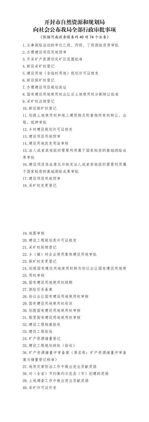 开封市自然资源和规划局向社会公布我局全部行政审批事项(依据河南政务服务网40项74个业务)